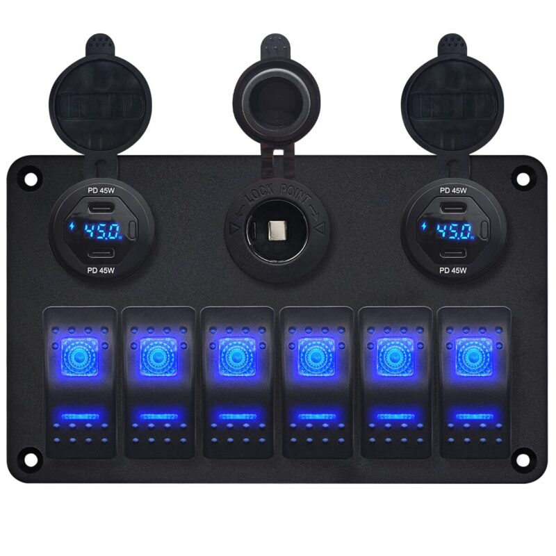 ProRide® Schakelpaneel 12V voor Auto/Boot – USB C Autolader 4 Poorten met Schakelaar/Wattagemeter – 45W/QC3.0 – 6 Schakelaars + 12V/24V Stopcontact – Blauw