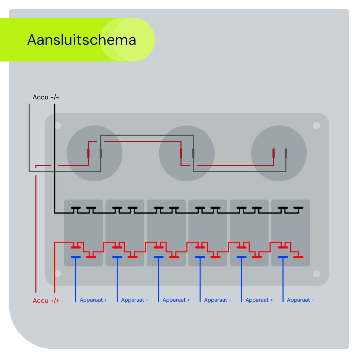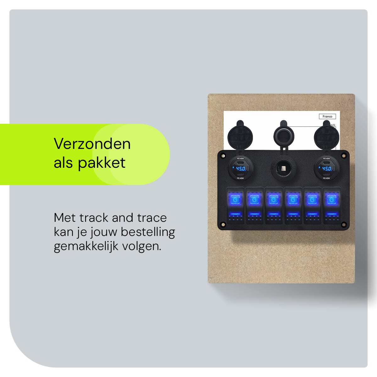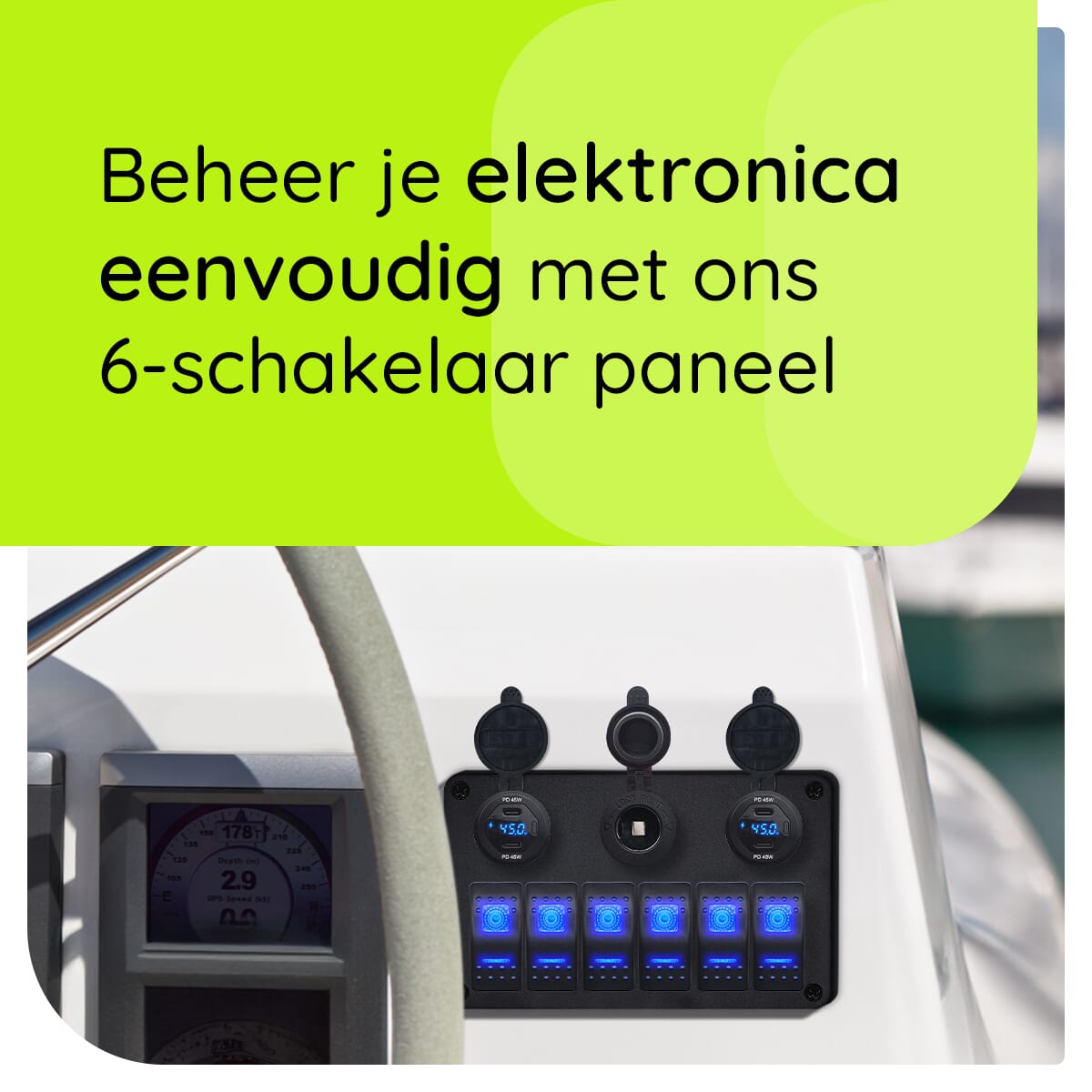 - Aantal schakelaars: 6 & één 12V/24V stopcontact