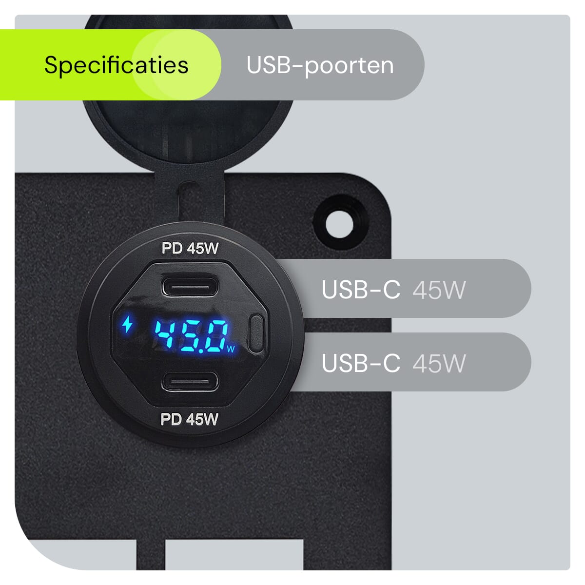- Real-time Energiebewaking: Houd de energieconsumptie nauwlettend in de gaten met de geïntegreerde wattagemeter, essentieel voor efficiënt energiebeheer in je voertuig.