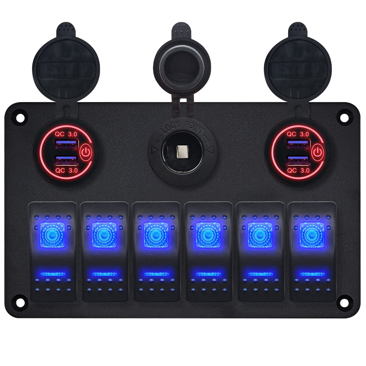 ProRide® Schakelpaneel 12V voor Auto/Boot – USB Stopcontact 4 Poorten met Schakelaar – QC3.0 – 6 Schakelaars + 12V/24V Stopcontact