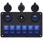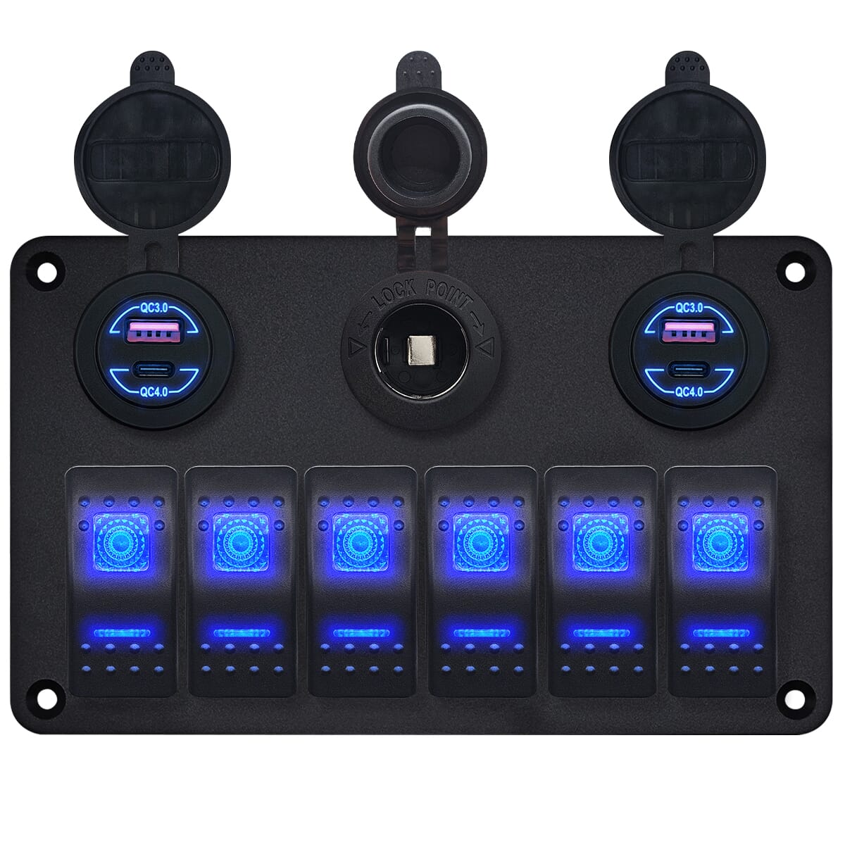 ProRide® Schakelpaneel 12V voor Auto/Boot – USB Stopcontact 4 Poorten – QC4.0 – 6 Schakelaars + 12V/24V Stopcontact – Blauw