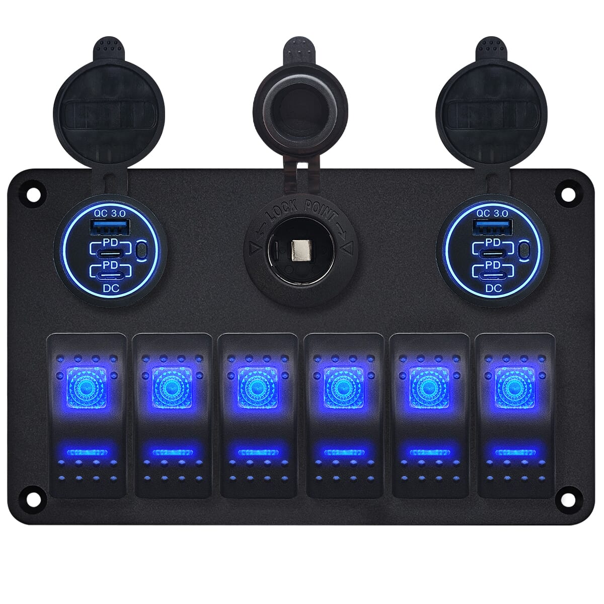 ProRide® Schakelpaneel 12V voor Auto/Boot – USB/USB C Stopcontact 6 Poorten met Schakelaar – QC3.0 – 6 Schakelaars + 12V/24V Stopcontact – Blauw