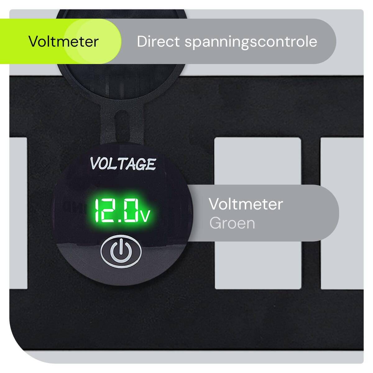 - Gebruiksvriendelijk: Eenvoudige installatie en bediening dankzij de duidelijke schakelaars en geïntegreerde voltmeter.