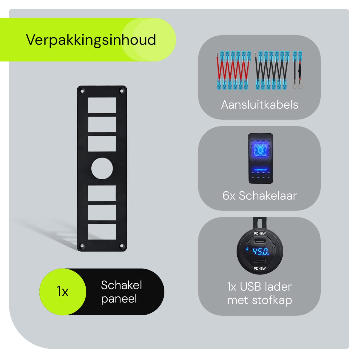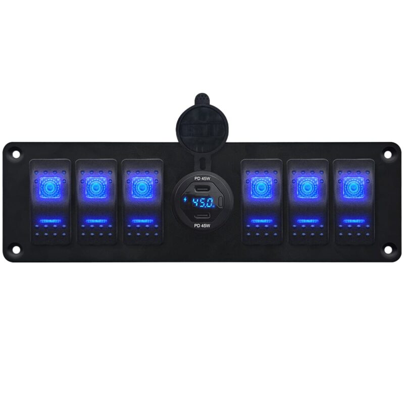 ProRide® Schakelpaneel 12V voor Auto/Boot – USB C Autolader 2 Poorten met Schakelaar/Wattagemeter – 45W/QC3.0 – 6 Schakelaars – Blauw