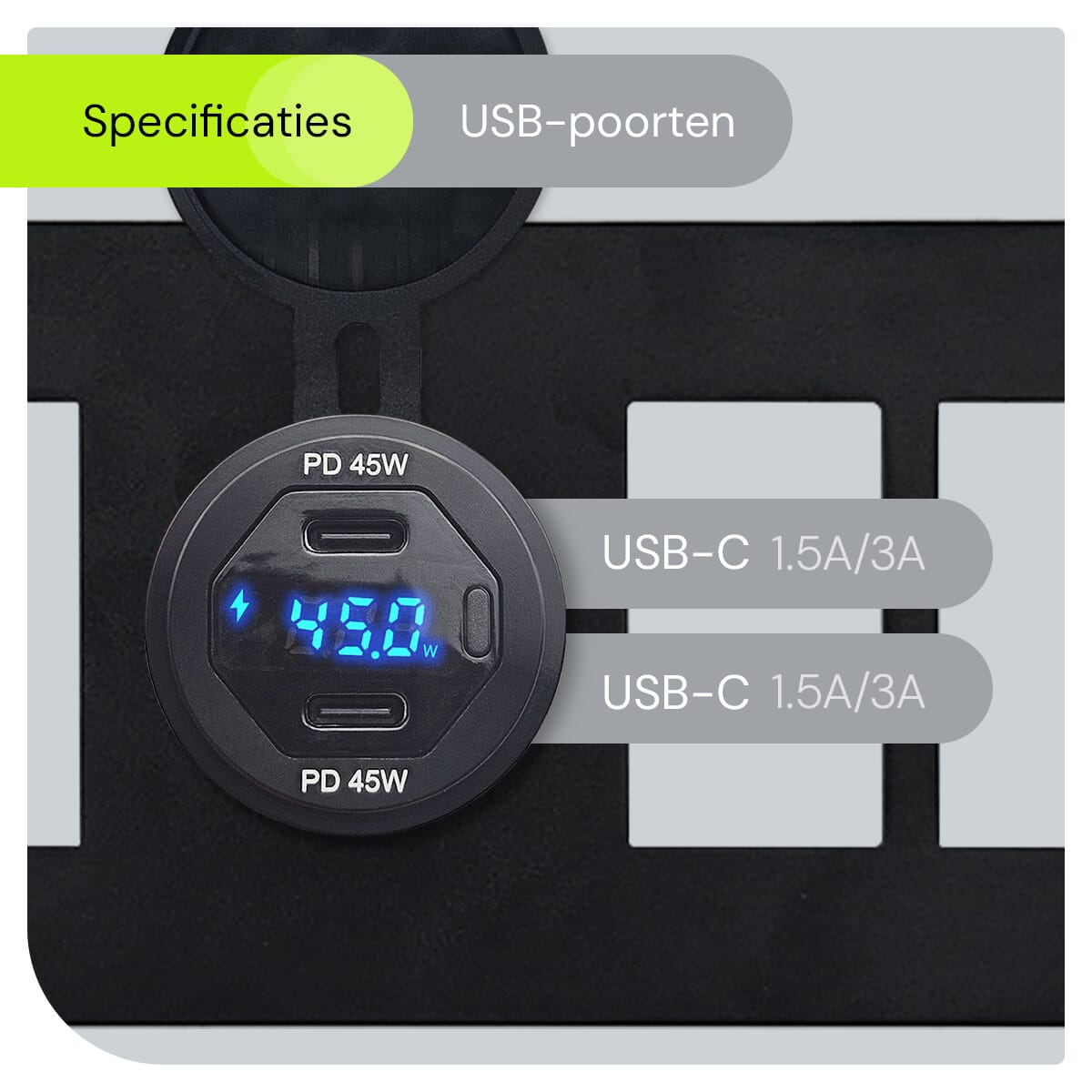 - Real-time Energiebewaking: Houd de energieconsumptie nauwlettend in de gaten met de geïntegreerde wattagemeter, essentieel voor efficiënt energiebeheer in je voertuig.