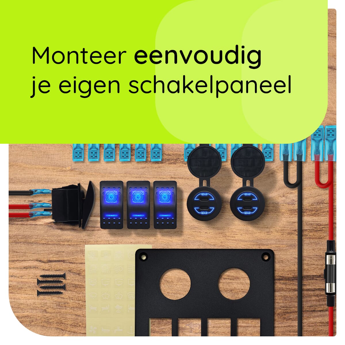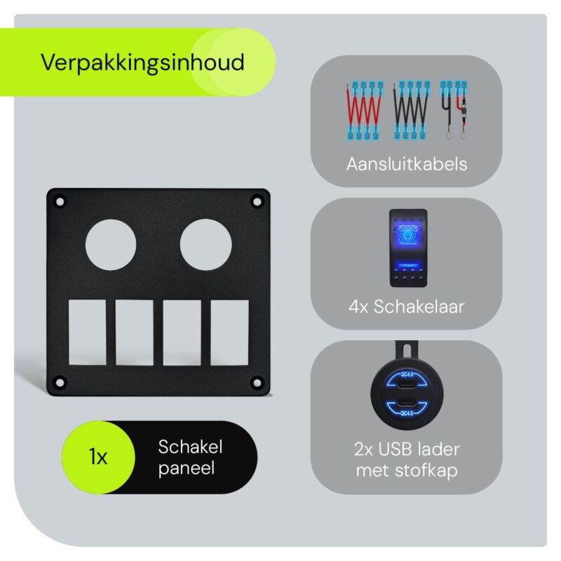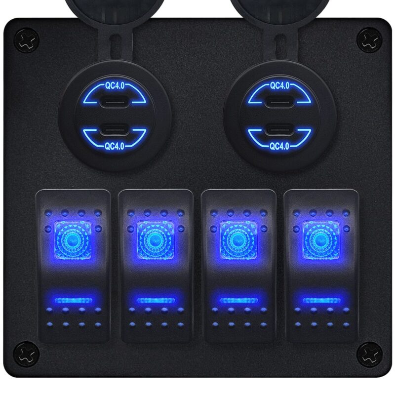 ProRide® Schakelpaneel 12V voor Auto/Boot – USB C Autolader 4 Poorten – 30W – QC4.0 – 3 Schakelaars – Blauw