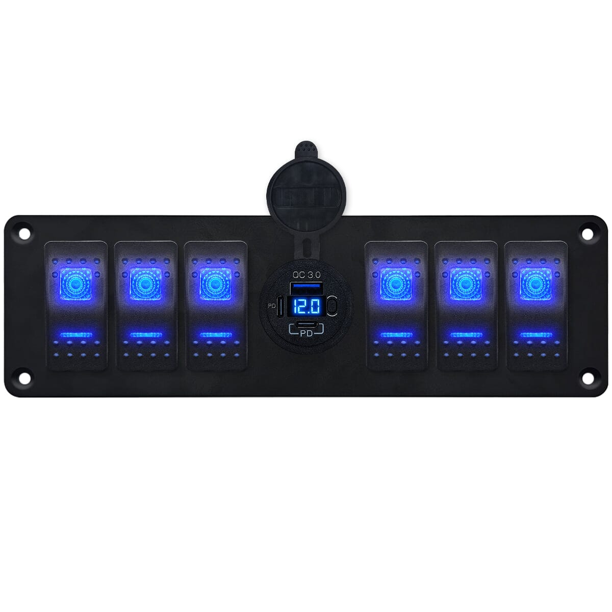 ProRide® Schakelpaneel 12V voor Auto/Boot – USB C Stopcontact met 3 Poorten, Schakelaar/Voltmeter, QC3.0 – Blauw