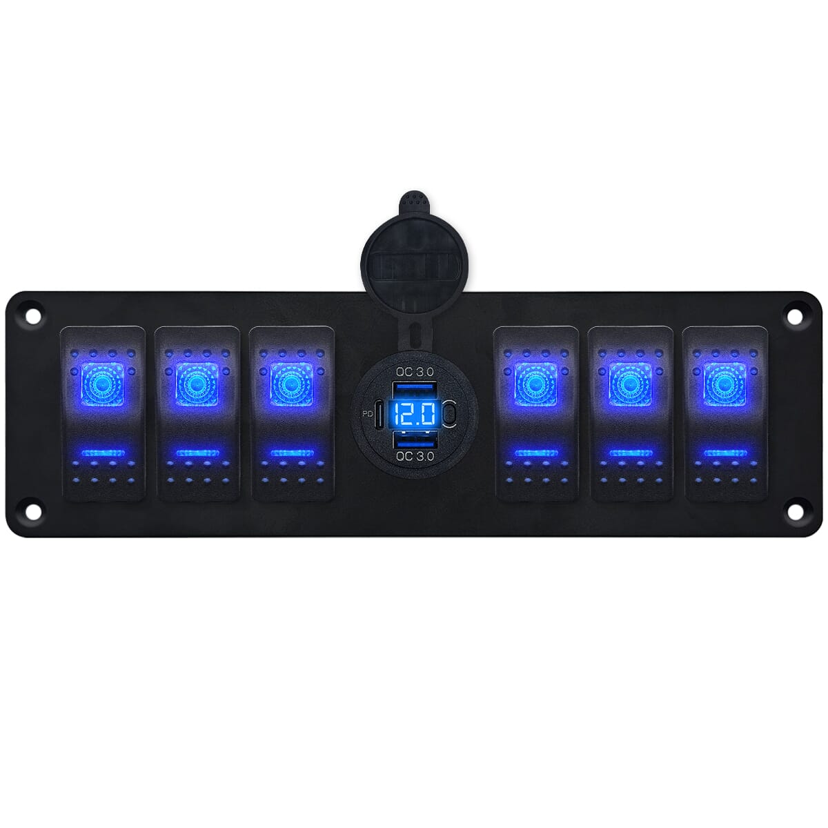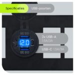 ProRide® Schakelpaneel 12V voor Auto/Boot – USB C Stopcontact met 3 Poorten, Schakelaar/Voltmeter, QC3.0 – Blauw
