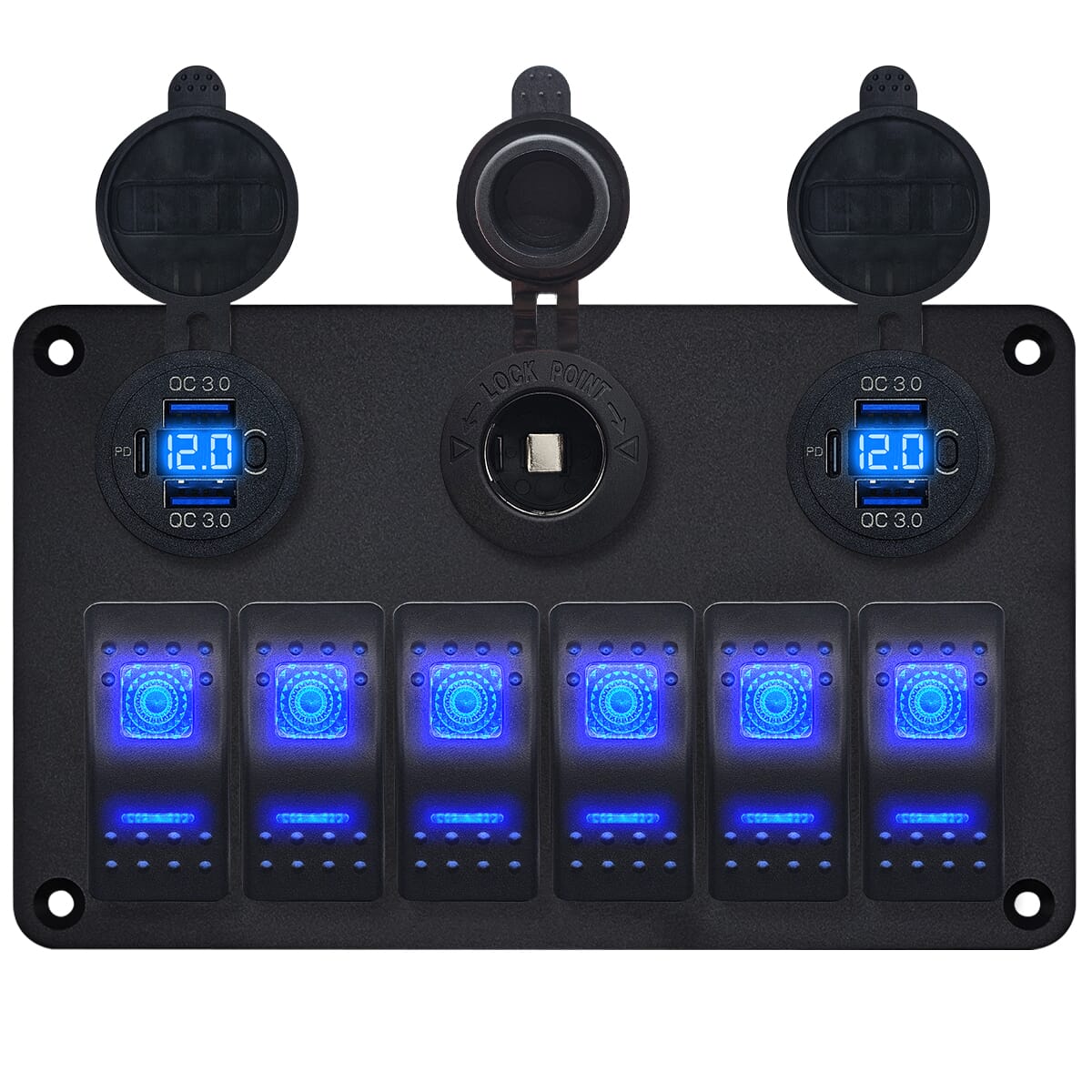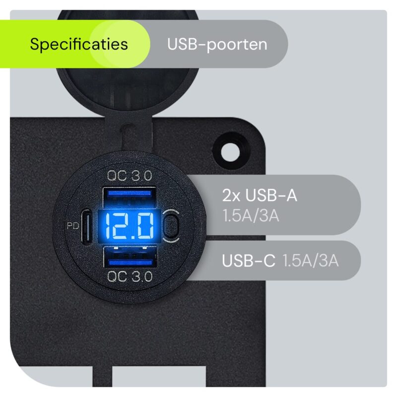 ProRide® Schakelpaneel 12V voor Auto/Boot – USB C Stopcontact met 6 Poorten, Schakelaar/Voltmeter, QC3.0 – Blauw