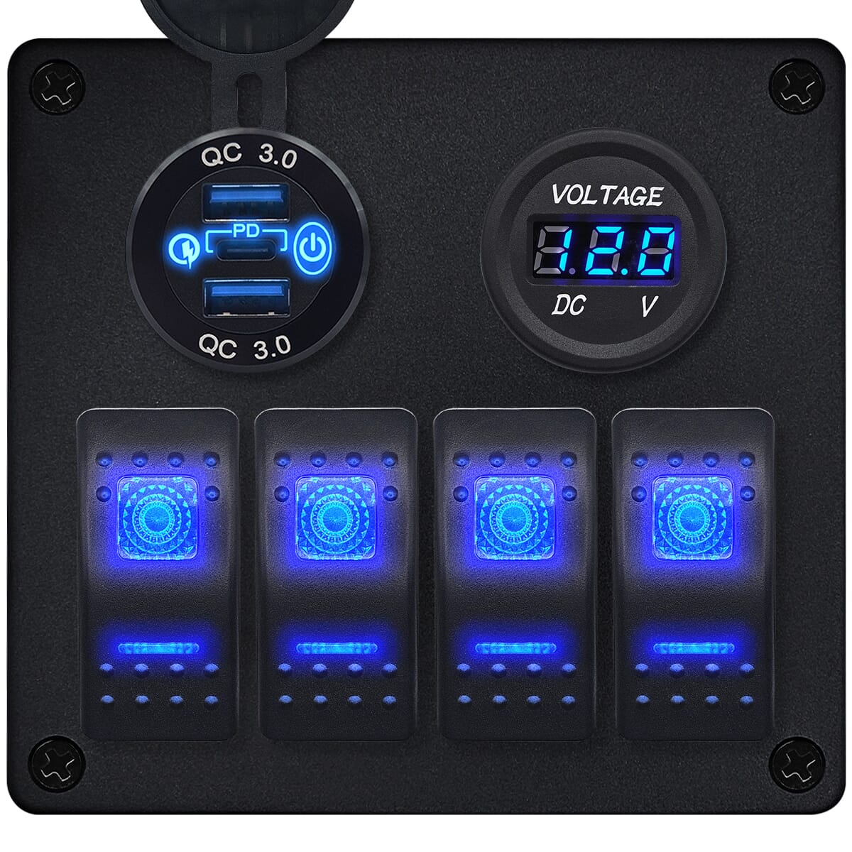 Het ProRide Schakelpaneel wordt aangesloten op een 12V stroombron, zoals de accu van je auto of boot. De drie USB-poorten bieden snelle laadmogelijkheden voor je apparaten, terwijl de voltmeter continu de spanning van je accu monitort. De vier schakelaars kunnen worden gebruikt om verschillende elektrische apparaten aan en uit te zetten, zoals verlichting of een koelbox.
