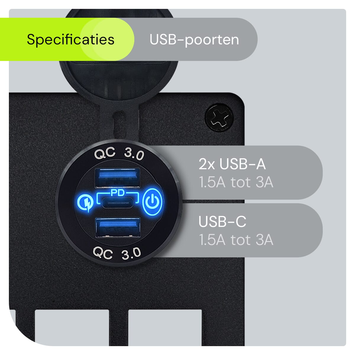 ProRide Schakelpaneel 12V voor Auto/Boot – USB Lader 3 Poorten met Voltmeter – QC3.0 – 3 Schakelaars