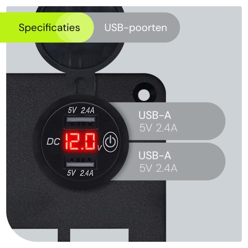 - Welke apparaten kan ik opladen met de USB-poorten? De USB-poorten zijn geschikt voor het opladen van smartphones, tablets, GPS-apparaten en andere USB-gevoede apparaten.