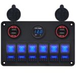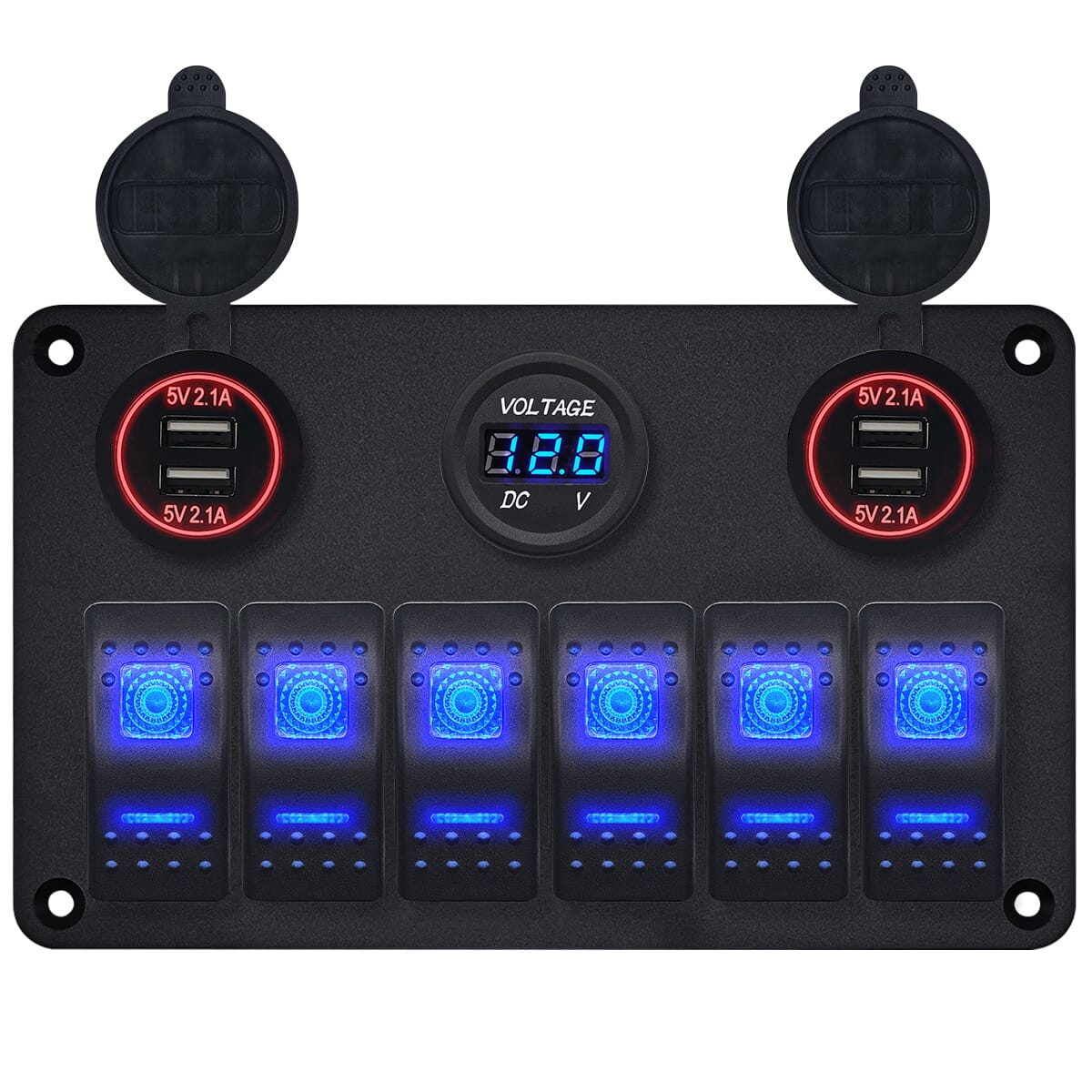 ProRide Schakelpaneel 12V voor Auto/Boot – USB Lader 4 Poorten met Voltmeter – 5V/2.1A – 6 Schakelaars