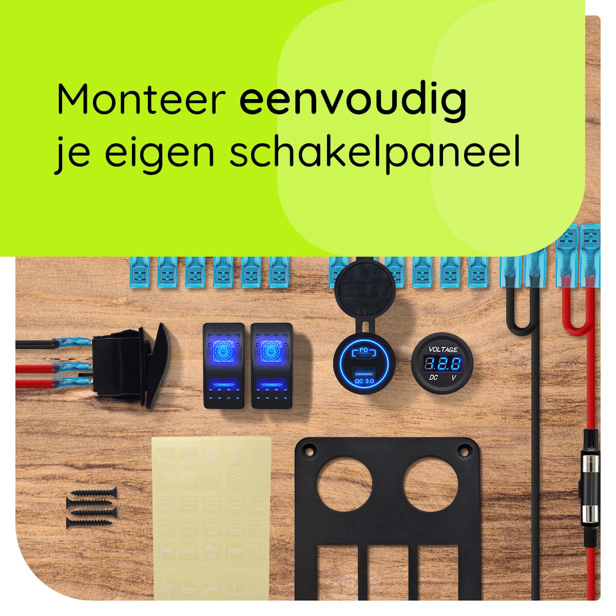 - Welke apparaten kan ik aansluiten op de schakelaars? Je kunt een breed scala aan 12V apparaten aansluiten, zoals verlichting, pompen en ventilatoren.