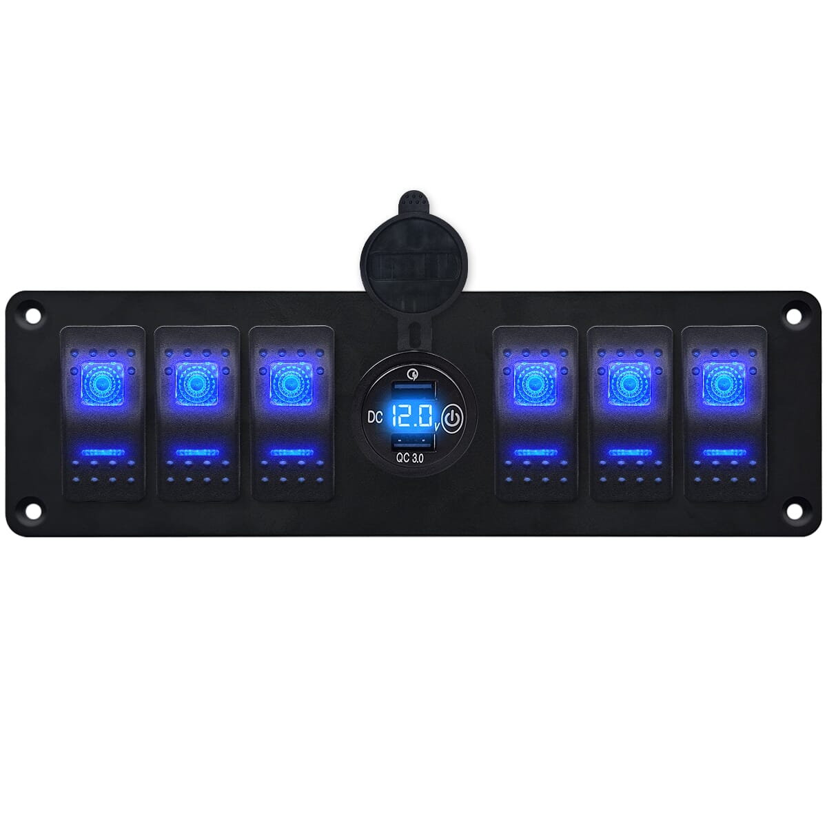 ProRide® Schakelpaneel 12V voor Auto/Boot – USB Stopcontact 2 Poorten met Schakelaar en Voltmeter – QC3.0 – 6 Schakelaars – Blauw