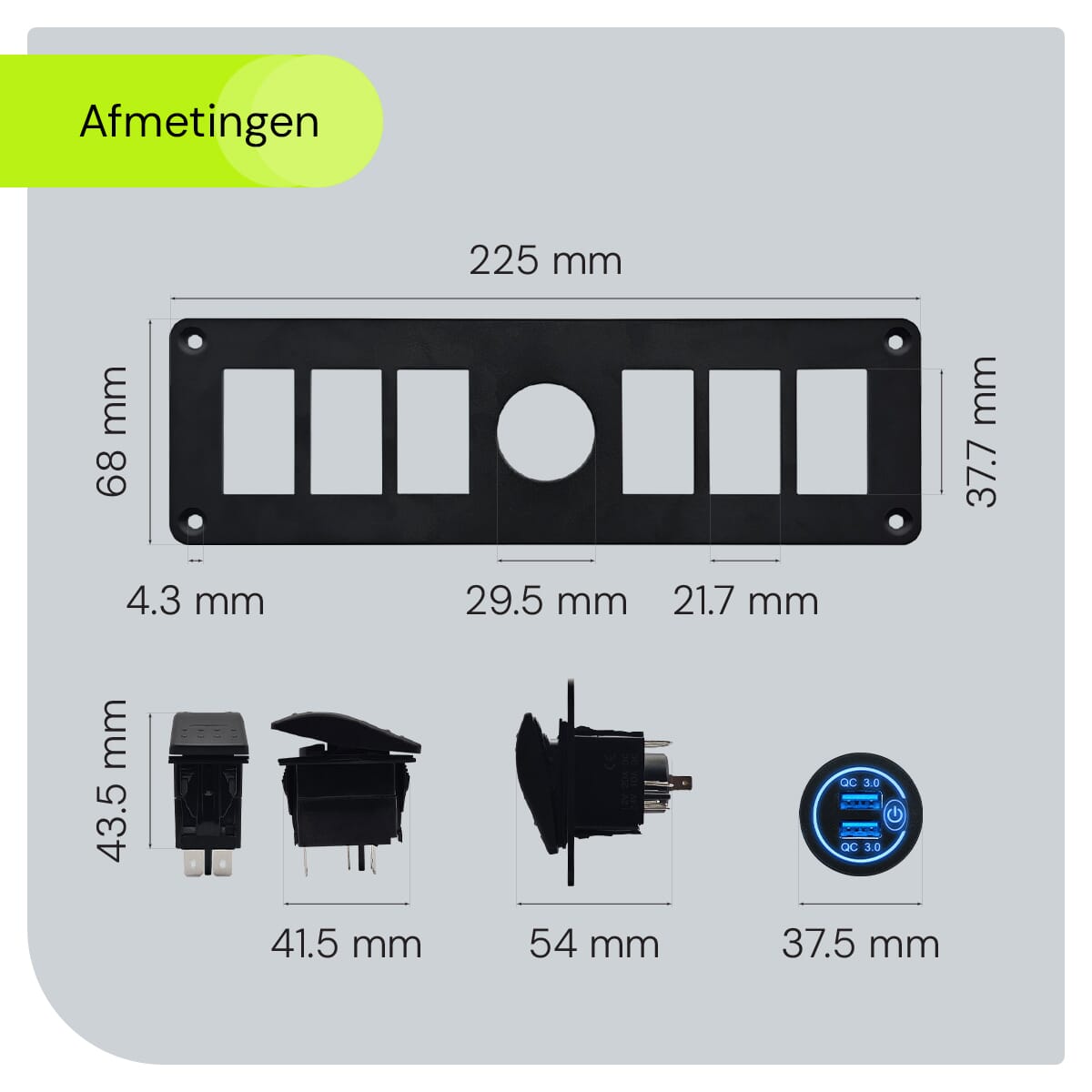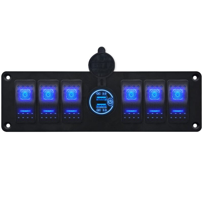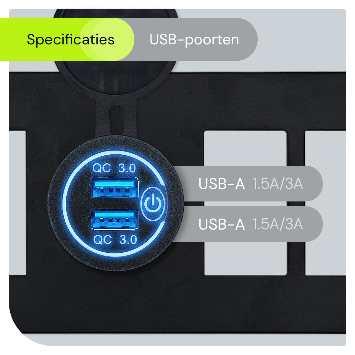 ProRide® Schakelpaneel 12V voor Auto/Boot – USB Stopcontact 2 Poorten met Schakelaar – QC3.0 – 6 Schakelaars