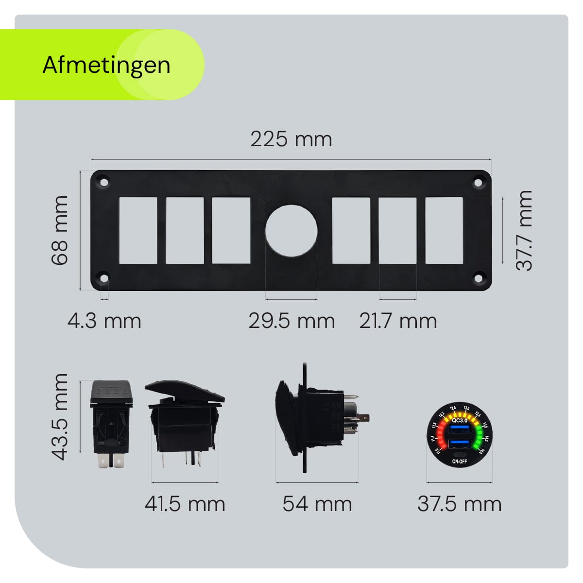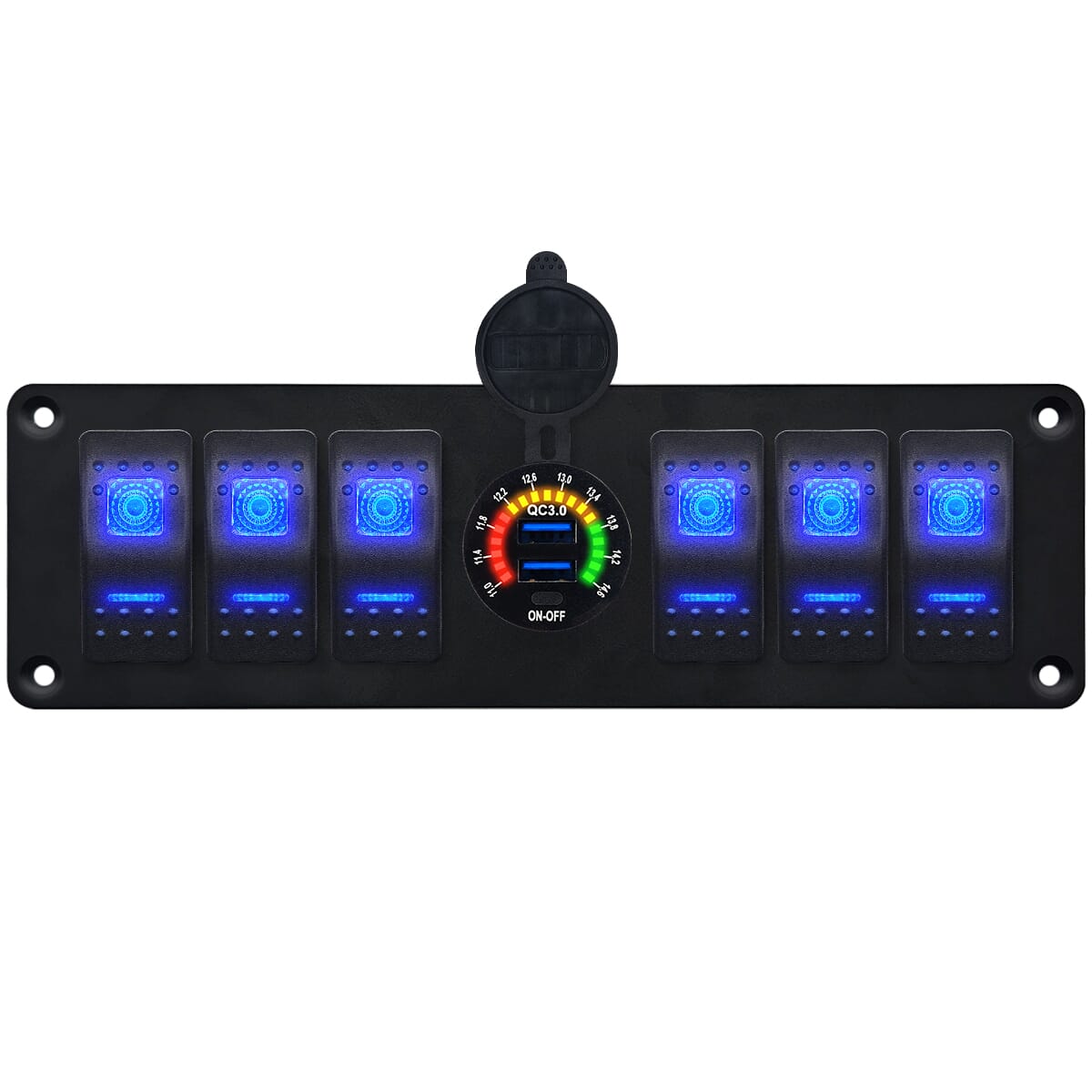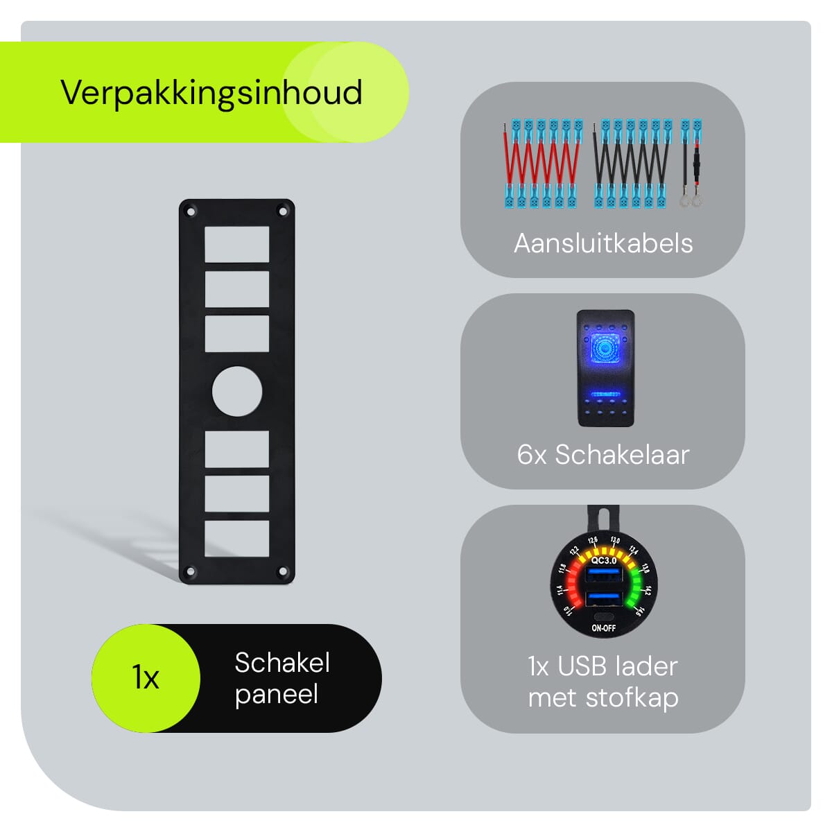 ProRide® Schakelpaneel 12V voor Auto/Boot – USB Stopcontact 2 Poorten met Schakelaar/Voltmeter – QC3.0 – 6 Schakelaars