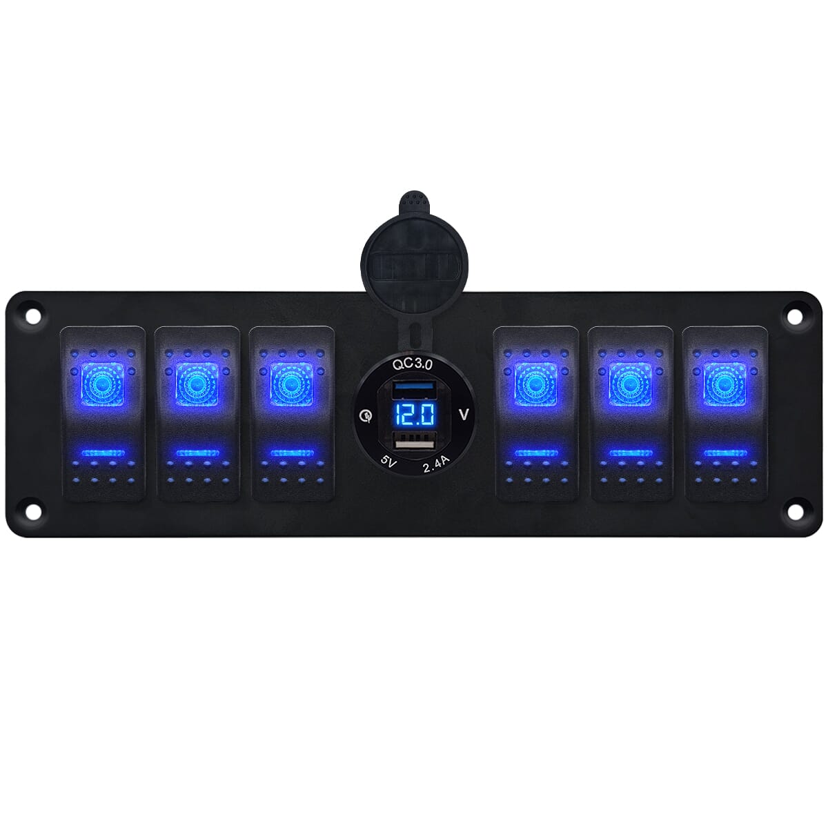 ProRide® Schakelpaneel 12V voor Auto/Boot – USB Stopcontact 2 Poorten met Voltmeter – 5V/2.4A – DS2114B – 6 Schakelaars – Blauw