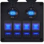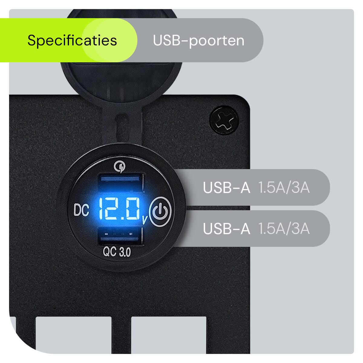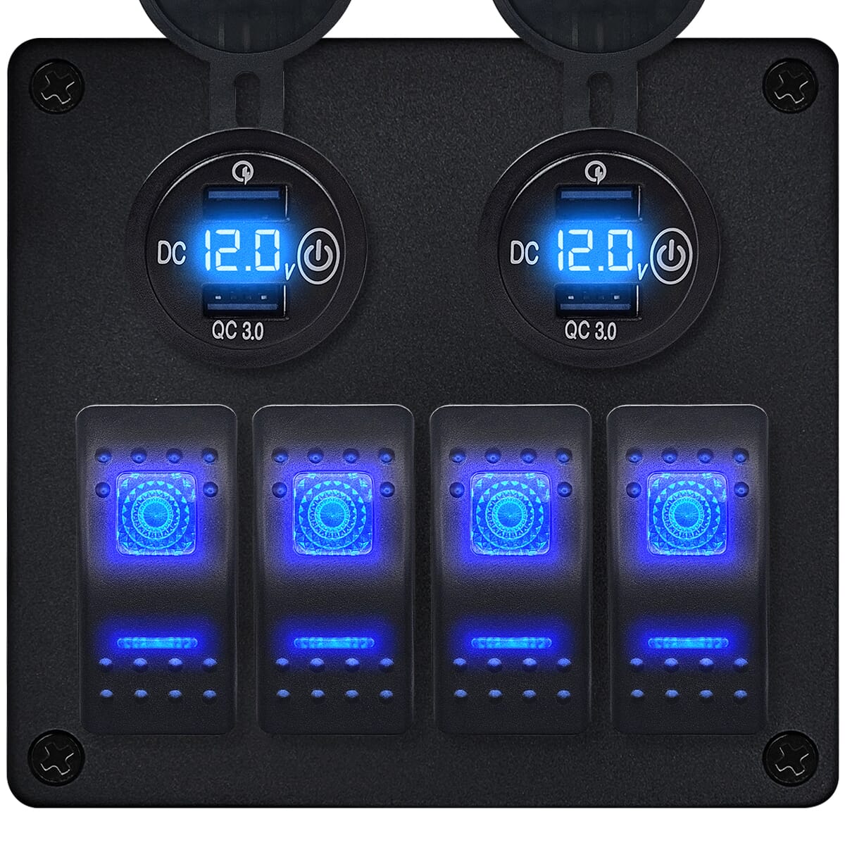 ProRide® Schakelpaneel 12V voor Auto/Boot – USB Stopcontact 4 Poorten met Schakelaar en Voltmeter – QC3.0 – 4 Schakelaars – Blauw
