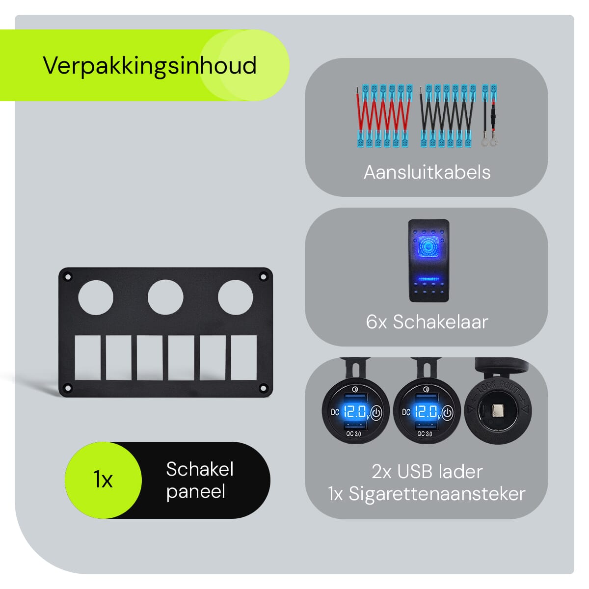 - Extra Functies: Schakelaar, voltmeter, 6 extra schakelaars, 12V/24V sigarettenaansteker stopcontact