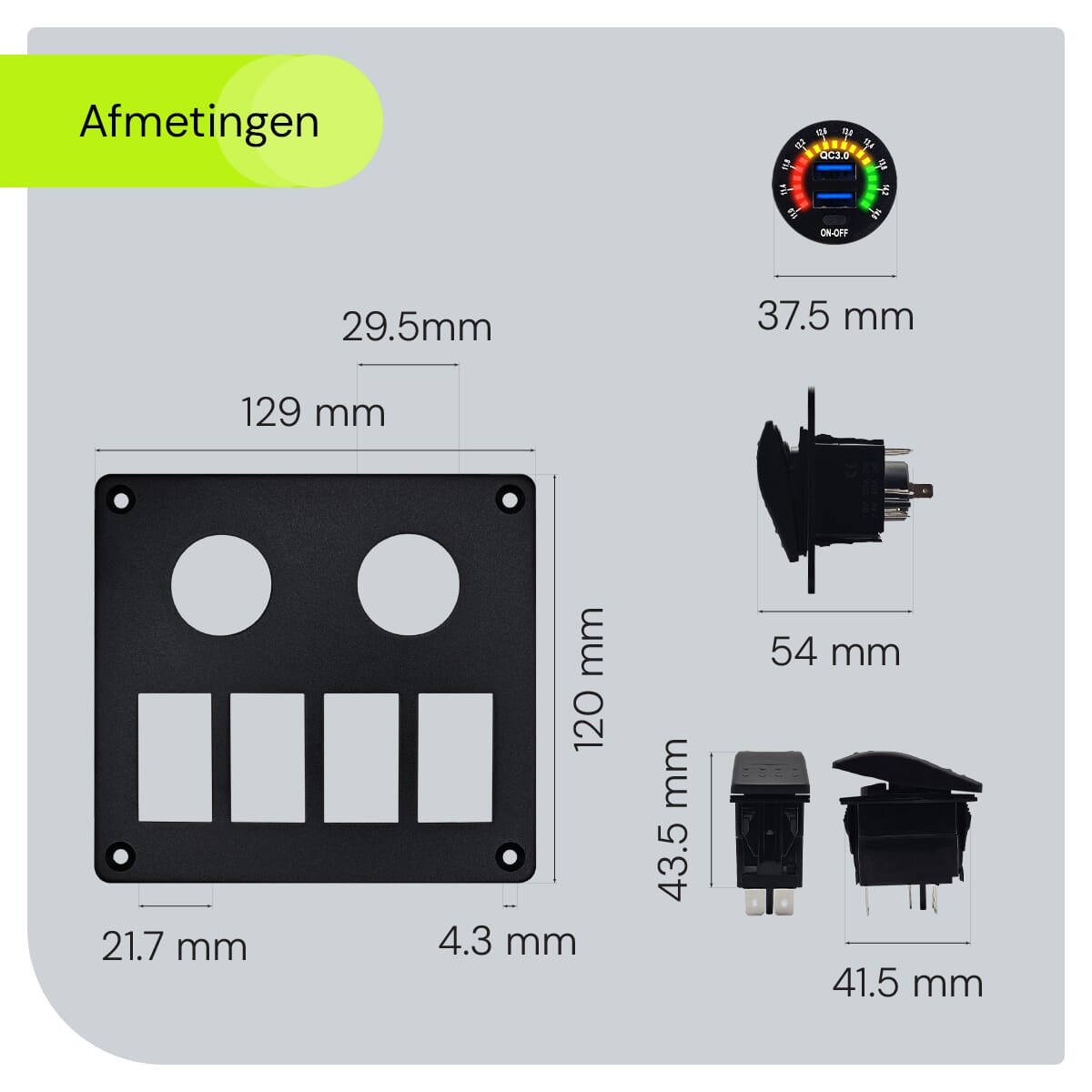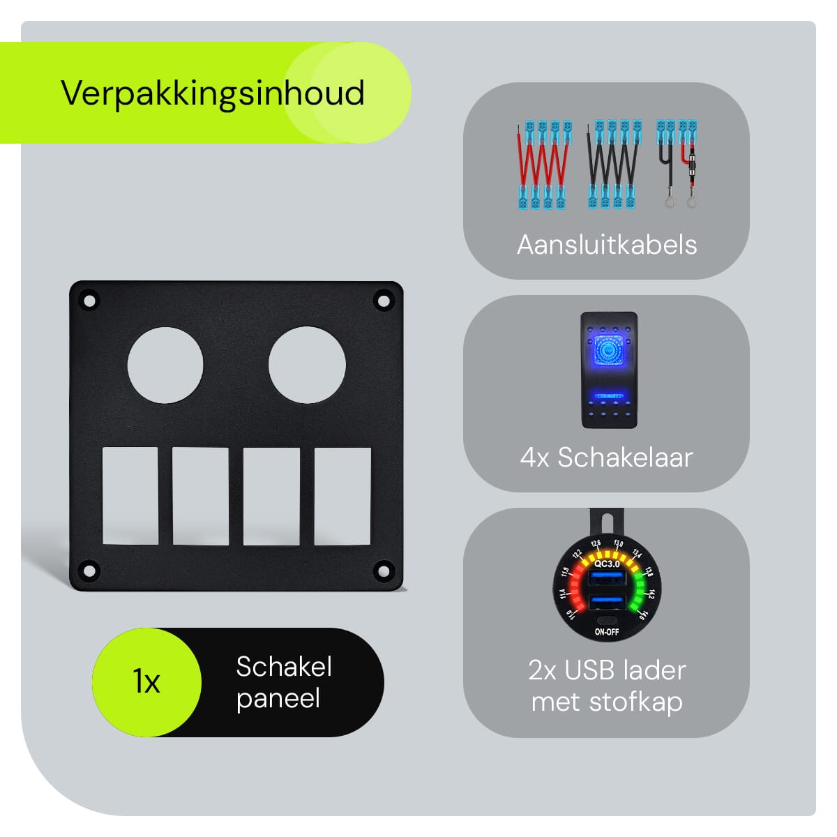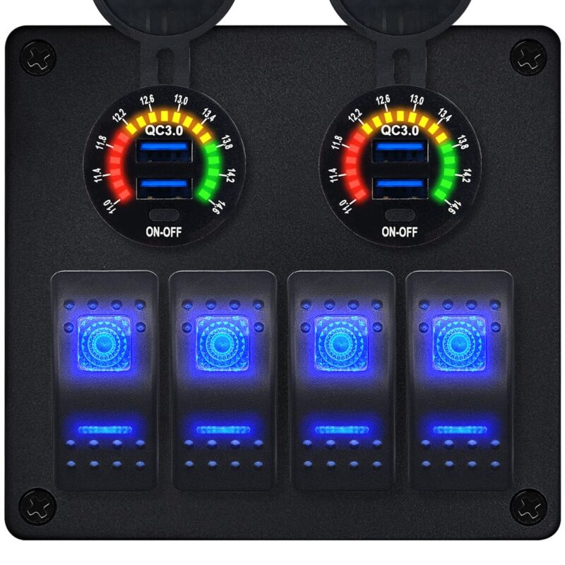 ProRide® Schakelpaneel 12V voor Auto/Boot – USB Stopcontact 4 Poorten met Schakelaar/Voltmeter – QC3.0 – 3 Schakelaars