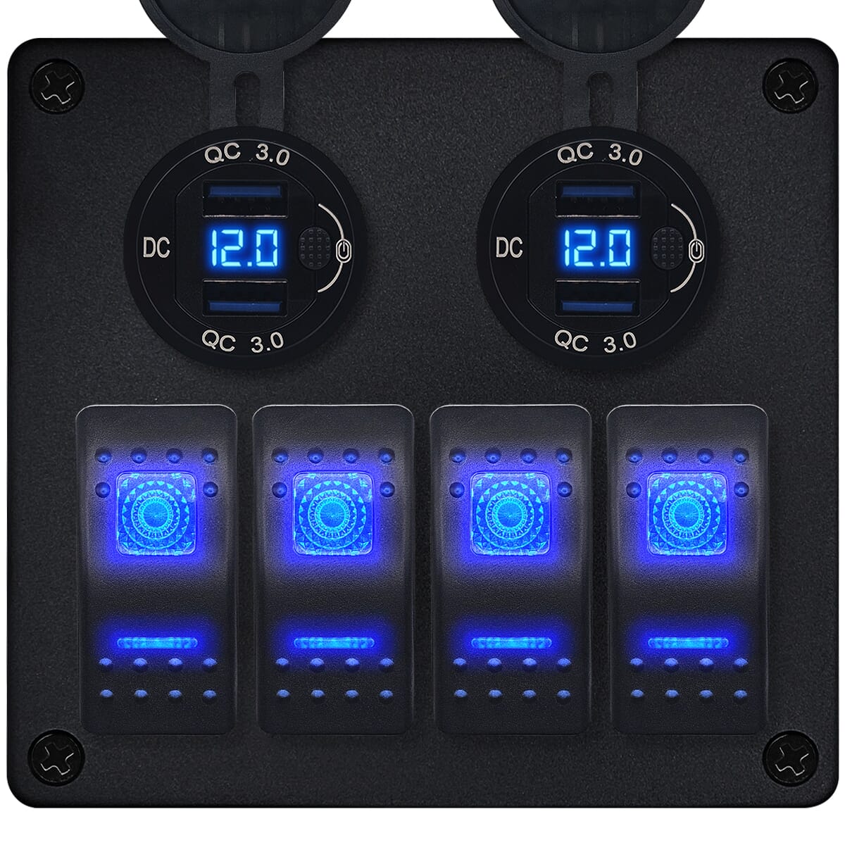 ProRide® Schakelpaneel 12V voor Auto/Boot – USB Stopcontact 4 Poorten met Schakelaar/Voltmeter – QC3.0 – 3 Schakelaars