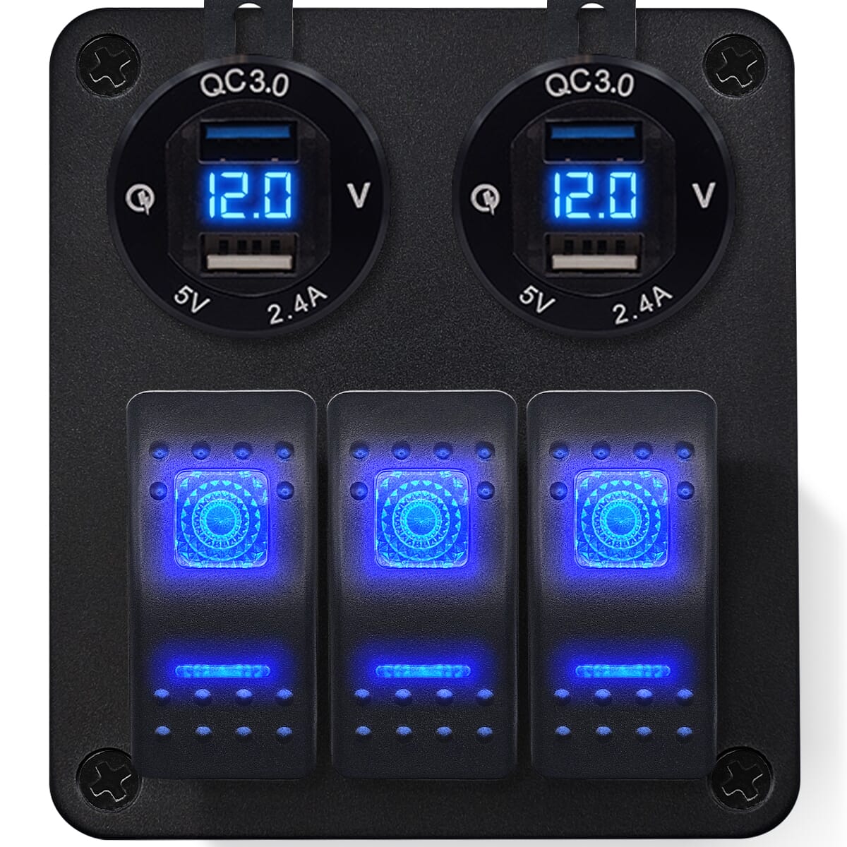 ProRide® Schakelpaneel 12V voor Auto/Boot – USB Stopcontact 4 Poorten met Voltmeter – 5V/2.4A – DS2114B – 3 Schakelaars – Blauw