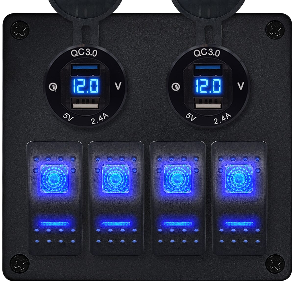 ProRide® Schakelpaneel 12V voor Auto/Boot – USB Stopcontact 4 Poorten met Voltmeter – 5V/2.4A – DS2114B – 3 Schakelaars – Blauw