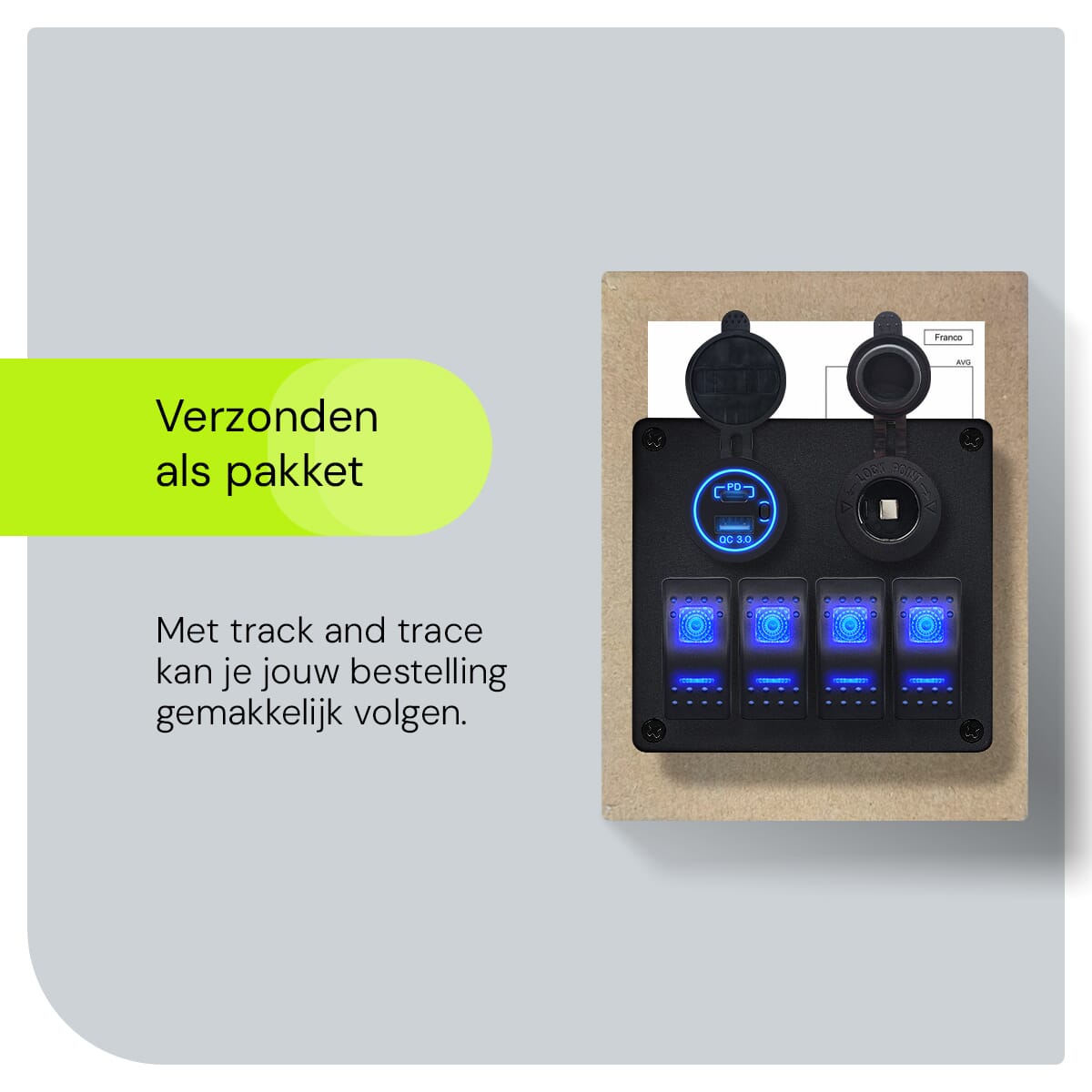 Het ProRide Schakelpaneel 12V wordt aangesloten op de 12V stroomvoorziening van je auto of boot. De ingebouwde USB en USB C poorten maken het mogelijk om meerdere apparaten tegelijkertijd op te laden. De sigaretten stopcontact biedt extra flexibiliteit voor het aansluiten van andere apparaten. De vier schakelaars geven je de controle over verschillende functies, zoals verlichting of andere accessoires.