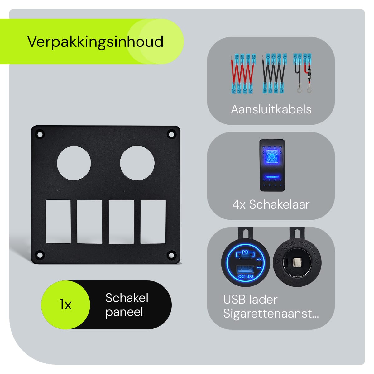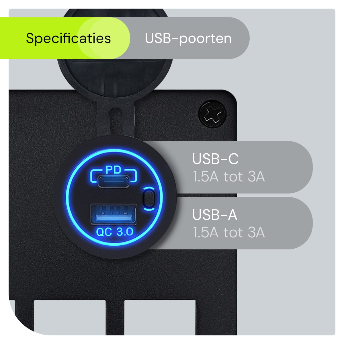 ProRide Schakelpaneel 12V voor Auto/Boot – USB/USB C Lader 2 Poorten met Sigaretten stopcontact – QC3.0 – 3 schakelaars