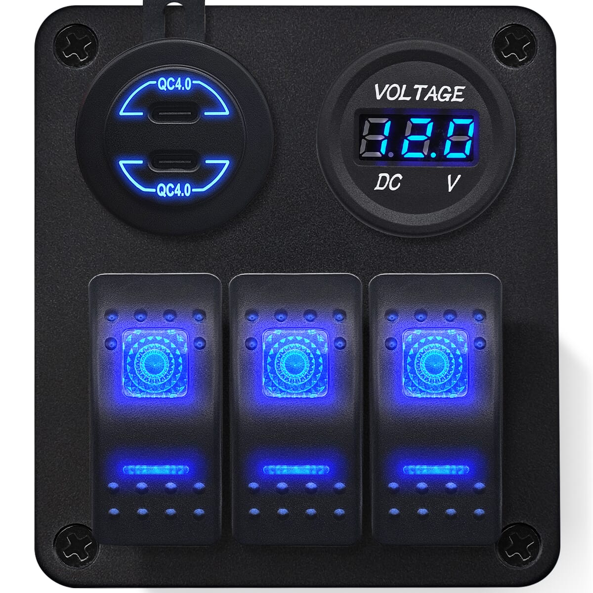 - Multifunctioneel: Combineert laadpoorten, een voltmeter en schakelaars in één compact paneel.