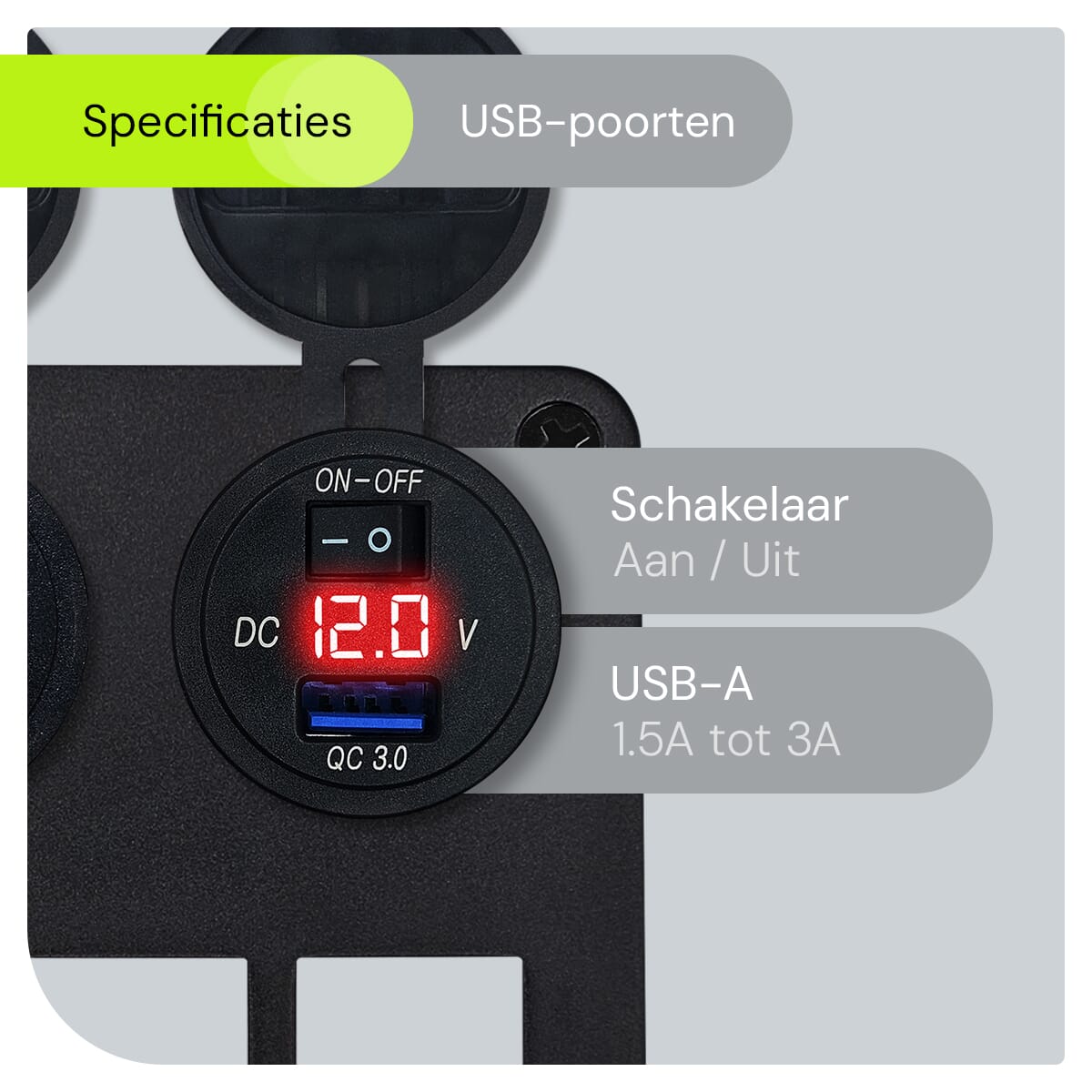 ProRide Schakelpaneel 12V voor Auto/Boot – USB/USB C Lader 3 Poorten met Voltmeter – QC3.0 – 3 Schakelaars