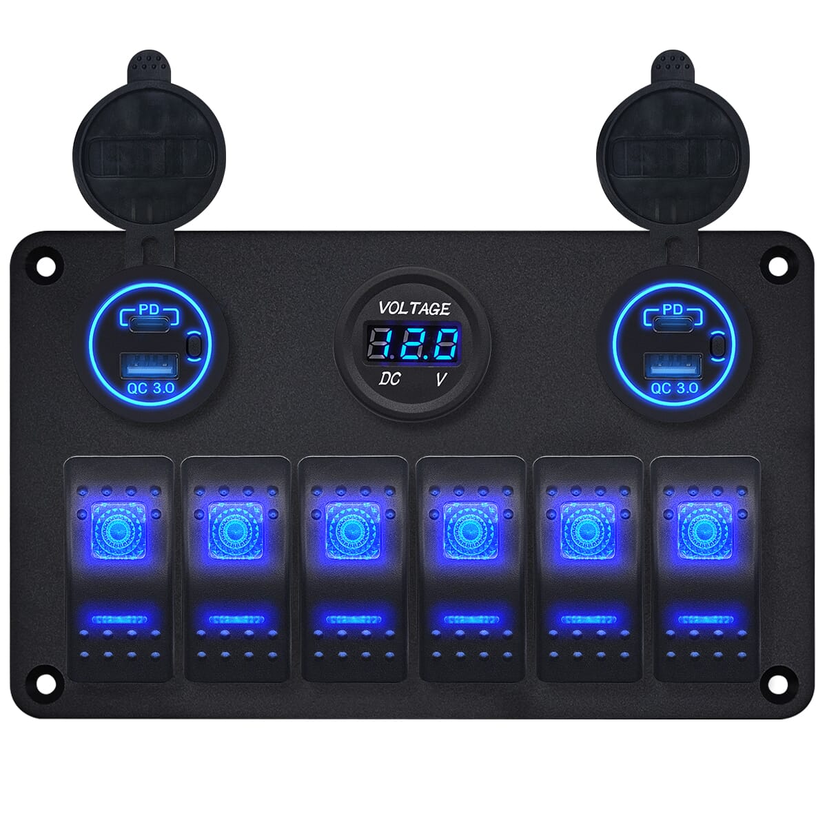 ProRide Schakelpaneel 12V voor Auto/Boot – USB/USB C Lader 4 Poorten met Voltmeter – QC3.0 – 6 Schakelaars