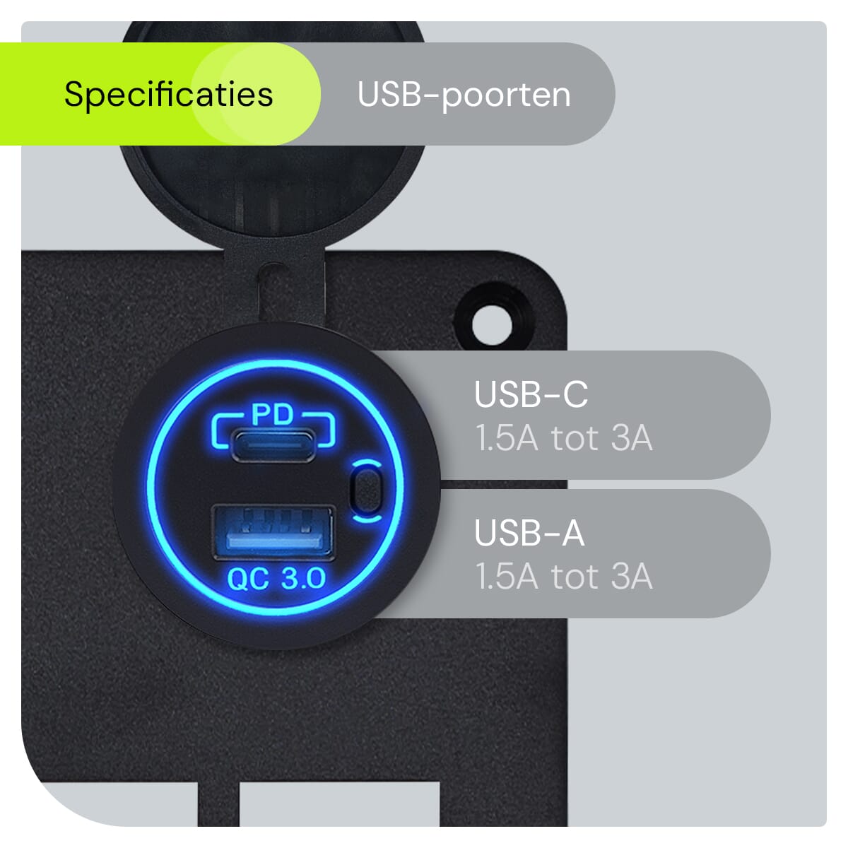 Het ProRide Schakelpaneel is uitgerust met vier laadpoorten, waaronder USB en USB C. Dit betekent dat je meerdere apparaten, zoals smartphones, tablets en andere gadgets, tegelijkertijd kunt opladen. De QC3.0 technologie zorgt ervoor dat je apparaten snel en efficiënt worden opgeladen.