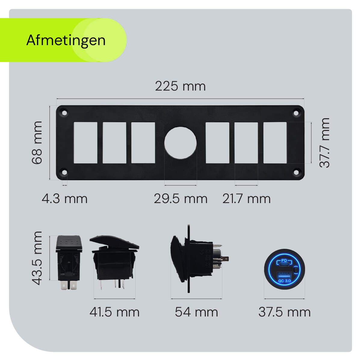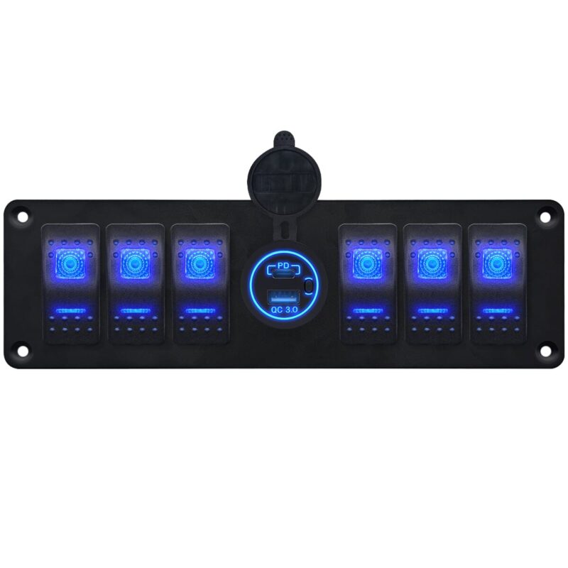 ProRide® Schakelpaneel 12V voor Auto/Boot – USB/USB C Stopcontact 2 Poorten met Schakelaar – QC3.0 – 6 Schakelaars – Blauw