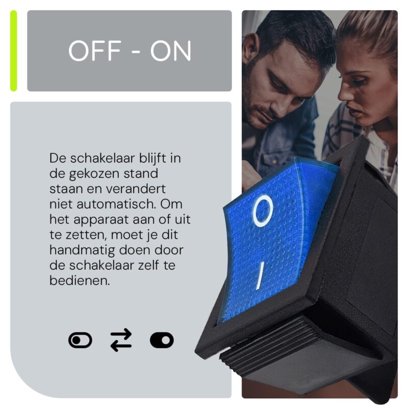 De ProRide Wipschakelaar werkt door het eenvoudig schakelen tussen de aan- en uit-stand. De schakelaar is 2-polig, wat betekent dat hij twee afzonderlijke circuits kan bedienen. Dit maakt hem ideaal voor toepassingen waar meerdere apparaten of systemen tegelijkertijd moeten worden bediend.
