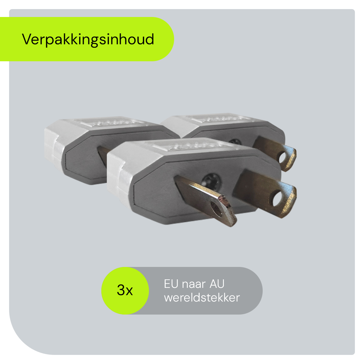 Of je nu op zakenreis gaat naar de Australië of een onvergetelijke vakantie plant, onze EU naar AU wereldstekker is jouw betrouwbare reisgezel. Deze compacte en handige adapter zorgt ervoor dat je moeiteloos al je elektronische apparaten kunt aansluiten en gebruiken zonder gedoe met verschillende stopcontactformaten.