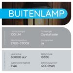 Met zijn warme witte licht van 2700-3200K zorgt deze lamp voor een gezellige sfeer in je tuin. Het compacte formaat van 12×17 cm en de elegante zwarte afwerking maken het een stijlvolle toevoeging aan elke buitenruimte.