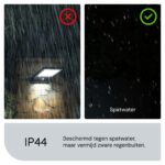 De Modee Solar Buitenlamp is ontworpen om de elementen te weerstaan. Met een IP44-classificatie is deze wandlamp buiten bestand tegen spatwater en stof, waardoor hij het hele jaar door betrouwbaar functioneert, ongeacht de weersomstandigheden.