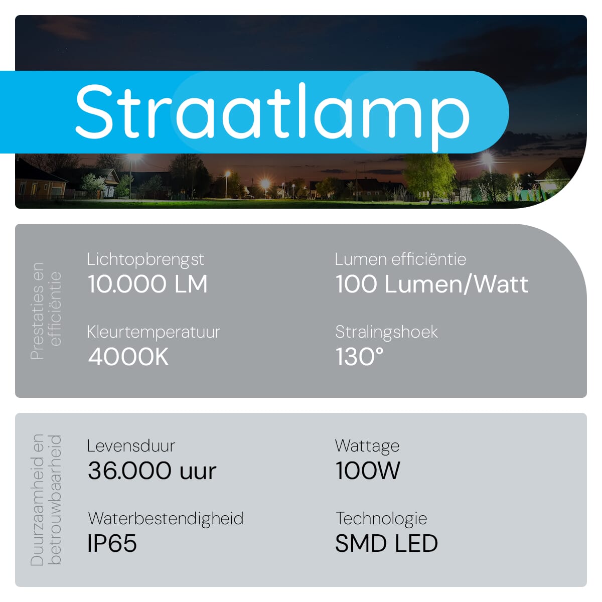 Met een vermogen van 100W en een lichtopbrengst van 10.000 lumen, biedt deze straatlamp een krachtige verlichting die jouw buitenruimte optimaal verlicht. De neutraal witte kleurtemperatuur van 4000K zorgt voor helder en aangenaam licht, ideaal voor straten, parkeerplaatsen of tuinen.