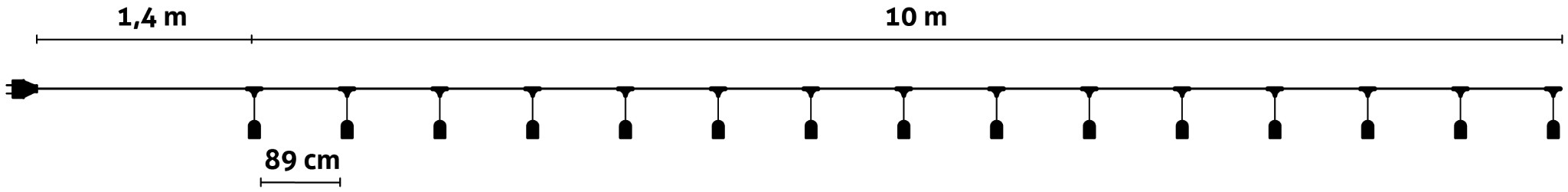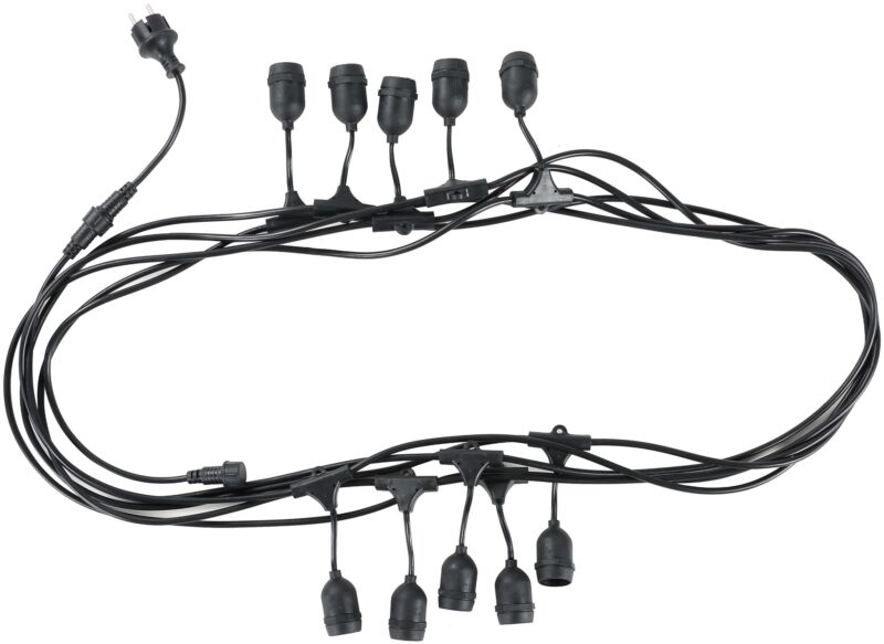 De lichtslinger wordt geleverd met 10 E27 fittingen, wat betekent dat je eenvoudig je favoriete lampen kunt toevoegen. Of je nu kiest voor sfeervolle gloeilampen, energiezuinige LED-lampen of kleurrijke feestverlichting, de installatie is een fluitje van een cent.