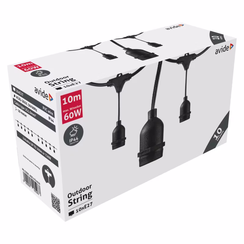 De Avide Lichtsnoer werkt op een spanning van AC85-265V en kan een maximaal vermogen van 720W aan. Sluit de lichtslinger eenvoudig aan op een stroombron, voeg je gewenste lampen toe aan de E27 fittingen, en geniet van de sfeervolle verlichting. De IP44-classificatie zorgt ervoor dat de lichtslinger veilig is voor buitengebruik.