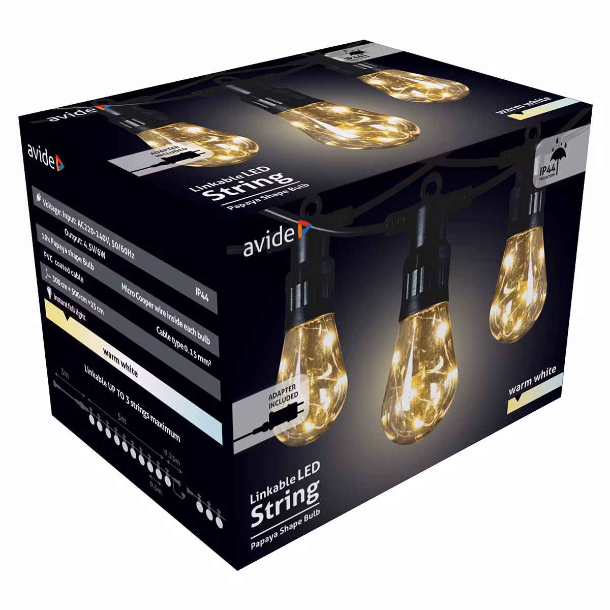 Dankzij de IP44-classificatie is de Avide Lichtsnoer bestand tegen regen en vocht. Dit maakt het een uitstekende keuze voor buitenverlichting, zelfs in wisselvallige weersomstandigheden.