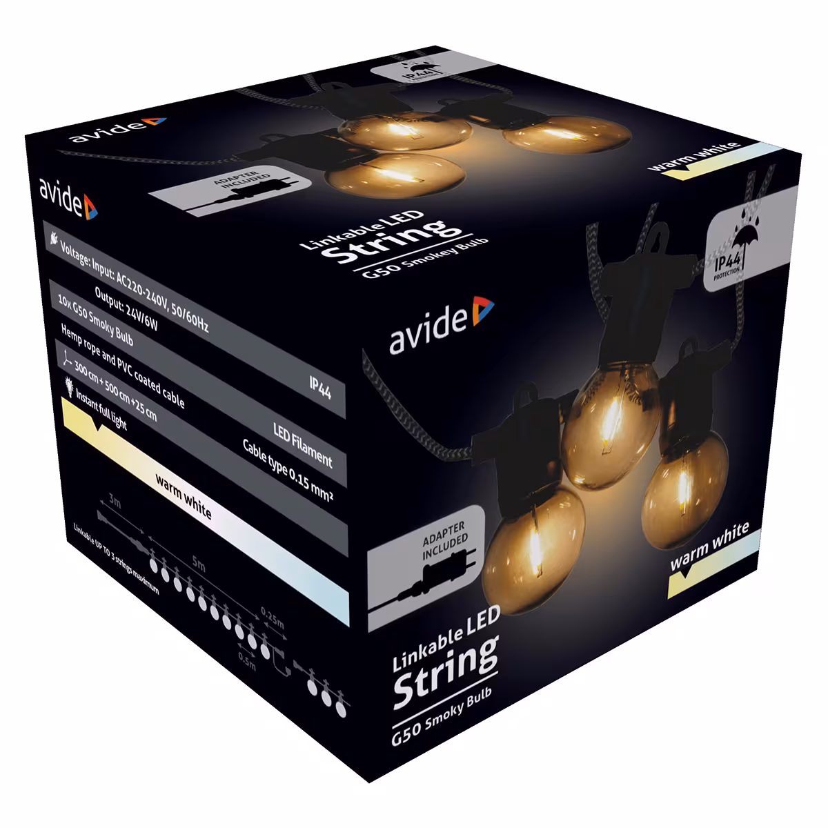 Met een IP44-classificatie is de Avide Lichtsnoer bestand tegen regen en vocht. Dit betekent dat je je geen zorgen hoeft te maken over het weer als je de lichtslinger buiten gebruikt. Ideaal voor tuinverlichting en andere buitenverlichting.