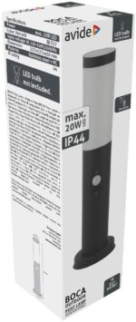 De Avide Staande Buitenlamp Boca met Bewegingssensor werkt op een standaard netspanning van 220-240V. De ingebouwde PIR-sensor detecteert beweging en schakelt de lamp automatisch in, wat zorgt voor directe verlichting wanneer dat nodig is. De lamp is eenvoudig te installeren en vereist minimale onderhoud.