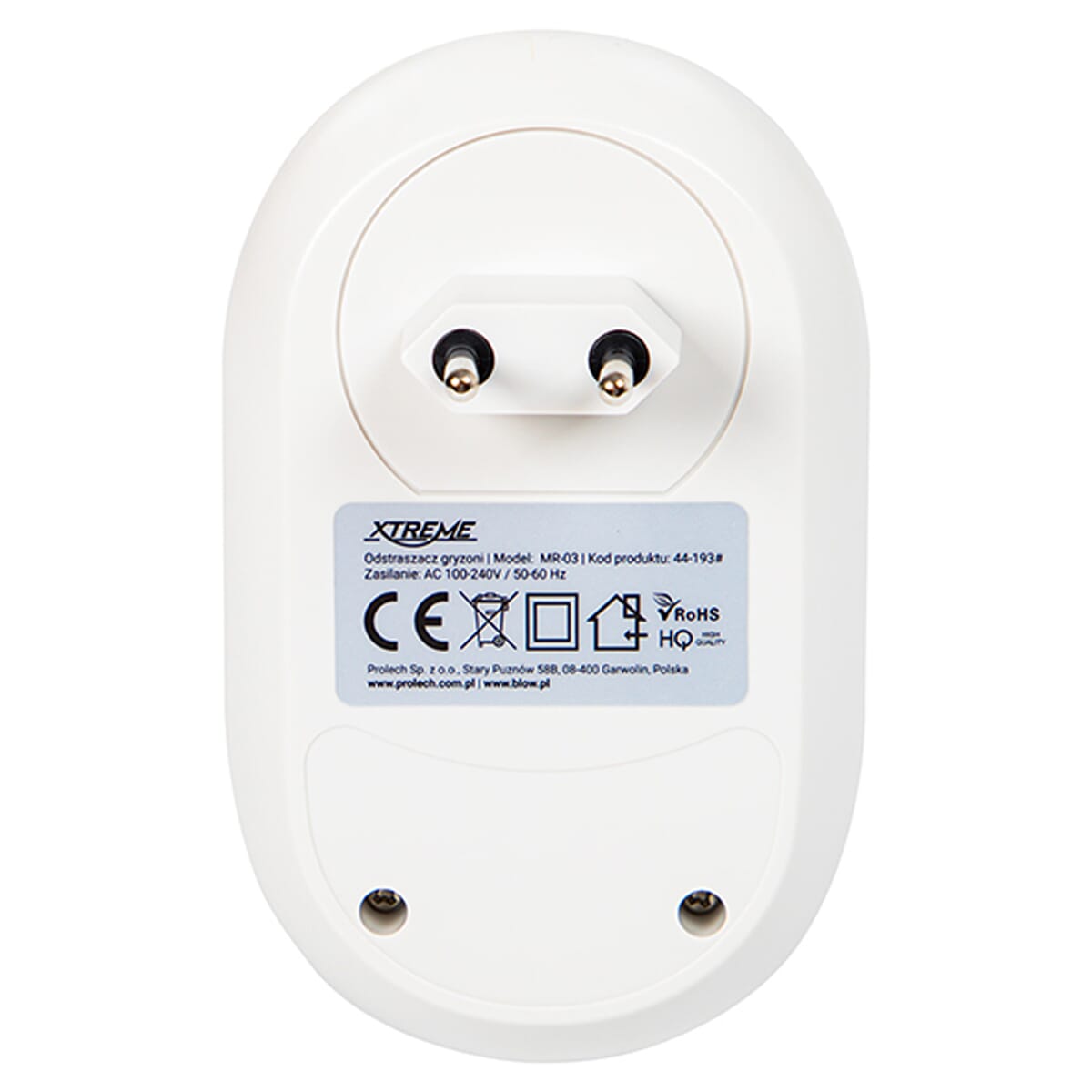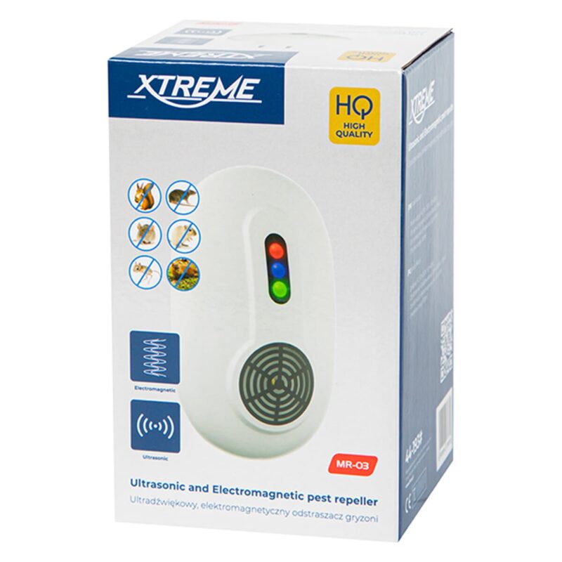 De EXTREME MR-03 Ongedierteverjager is een elektronisch apparaat dat ultrasone geluidsgolven uitzendt om muizen en ratten af te schrikken. Dit product is ontworpen voor gebruik in woningen, kantoren en andere binnenruimtes waar ongedierte een probleem kan vormen. Het apparaat biedt een humane en chemievrije oplossing voor het verjagen van ongewenste dieren.