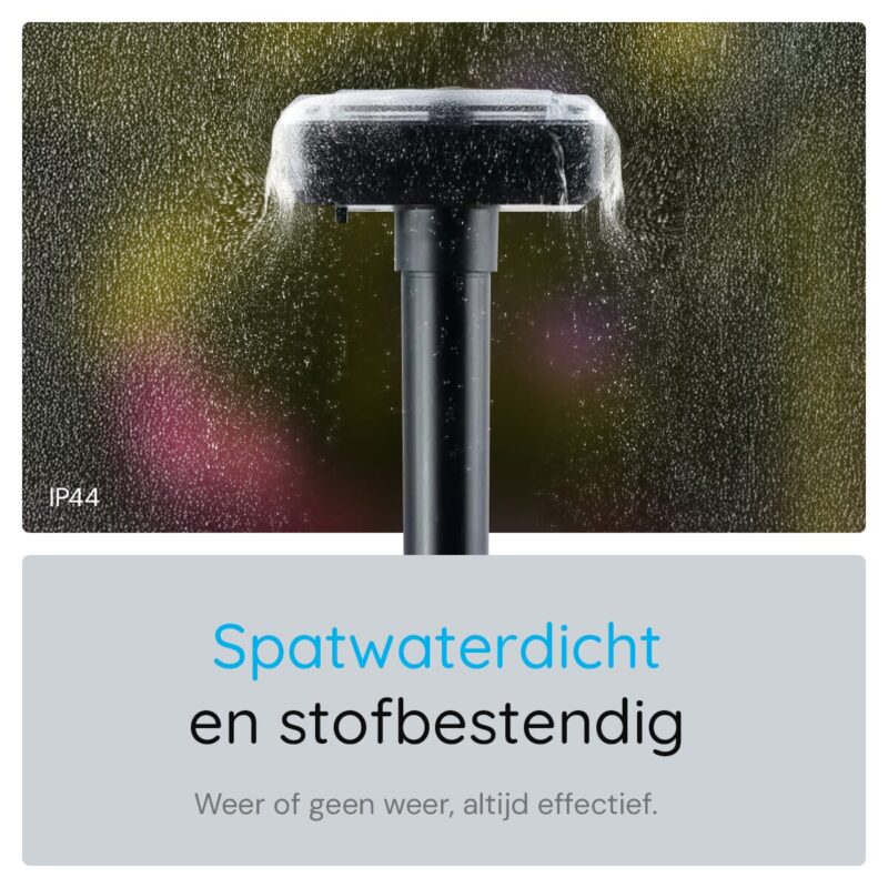 - Waterdicht ontwerp: Dankzij de IP44-classificatie blijft de verjager effectief, zelfs bij regenachtig weer.
