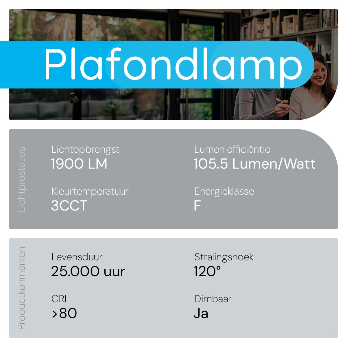 Deze LED plafondlamp levert maar liefst 1900 lumen, wat voldoende is om zelfs de grootste ruimtes te verlichten. En dat allemaal met een energieverbruik van slechts 18W, wat betekent dat je aanzienlijk op je energiekosten bespaart zonder in te boeten op helderheid.