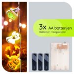 Plaats eenvoudig de 3 AA-batterijen in het batterijvakje, schakel de verlichting in, en laat de magie beginnen. Hang het lichtsnoer op je gewenste locatie en geniet van de sfeervolle verlichting die je Halloween decoratie compleet maakt.
