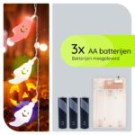 Het Halloween Lichtsnoer is voorzien van 20 LED-lampjes, die elk omhuld zijn met een doorzichtig spookje. De lampjes worden gevoed door 3 AA-batterijen (inbegrepen), waardoor je geen stopcontact nodig hebt. Plaats de batterijen in de batterijhouder, zet de schakelaar aan, en geniet van het kleurrijke lichtspel dat je ruimte vult.